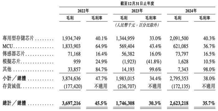 2024年,专用型存储芯片贡献了其超过70%的收入,MCU收入占比为23%,传感器芯片占比为6.1%。