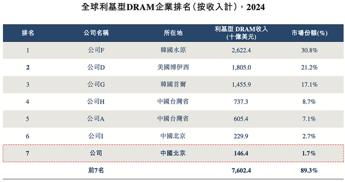 2024年,全球利基型DRAM的市场份额高度集中在海外大厂企业,前三家企业合计约占市场总规模的69.1%。其中,兆易创新2024年的收入约为1.46亿美元,市场份额约为1.7%,在全球企业中排名第七,也是排名第二的中国内地企业。