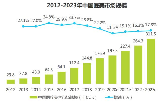 数据显示,2019年中国医疗美容市场规模达到1769亿元,增长率为22.2%;2019年中国医美用户1367.2万人,预测2023年医美用户达2548.3万人。近年来,受网红文化影响,医美行业迎来了消费者需求的爆发。
