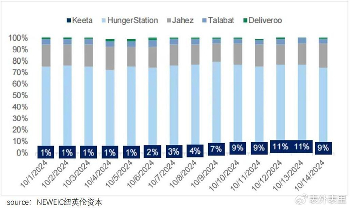 Keeta 9月登陆沙特,10月中旬就被曝拿下了当地外卖市场10%的份额,而且是在海湾六国外卖用户渗透率接近50%,近乎于国内水平的竞争环境下。