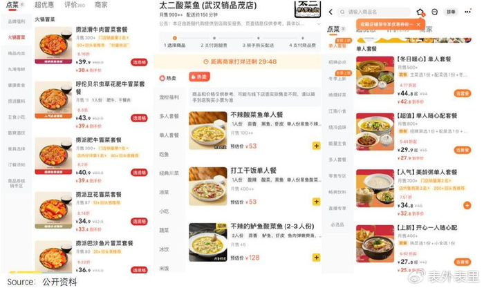 但如今这些商家,很多都在美团上推出了20-50元单人外卖餐,消费者花40元就可以吃到海底捞的牛肉冒菜套餐。