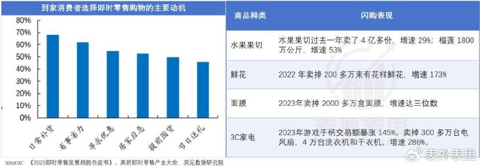这背后,是懒得逛街又不想等猫狗拼的年轻人们,开始涌入外卖平台买手机、买被子、买轮椅……数据显示,即时零售消费者在日常补货、省事省力等方面的需求,已显著高于买药等居家应急。
