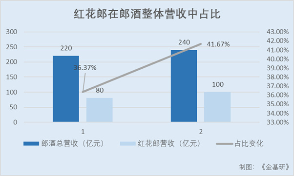 从营收占比维度分析,红花郎在郎酒整体营收中的占比,2023年约为36.37%,2024年提升至41.67%,可见相较于2023年,2024年红花郎营收占比实现了显著增长。