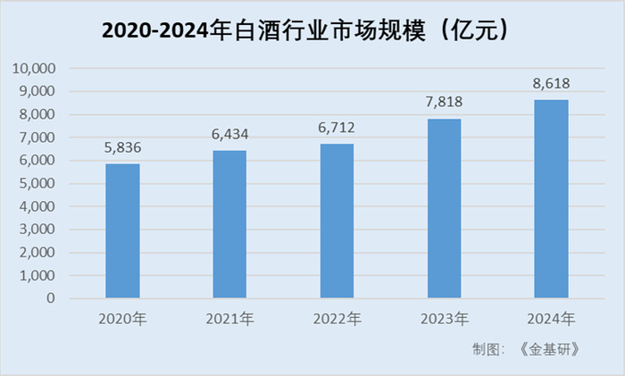 根据艾媒咨询《2025年中国白酒行业发展状况与消费行为调查数据》显示,2020-2024年白酒行业市场规模分别为5,836亿元、6,434亿元、6,712亿元、7,818亿元、8,618亿元。