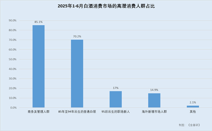 据《2025中国白酒市场中期研究报告》,2025年1-6月白酒消费市场的高潜消费人群里,85 年至94年出生的普通白领消费占比达70.02%,而95后出生的职场新人占17%。