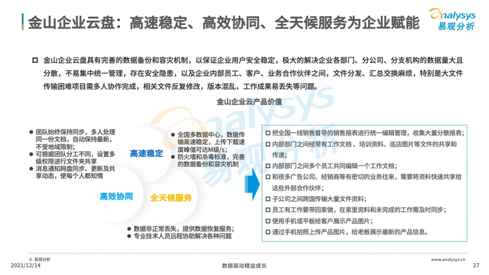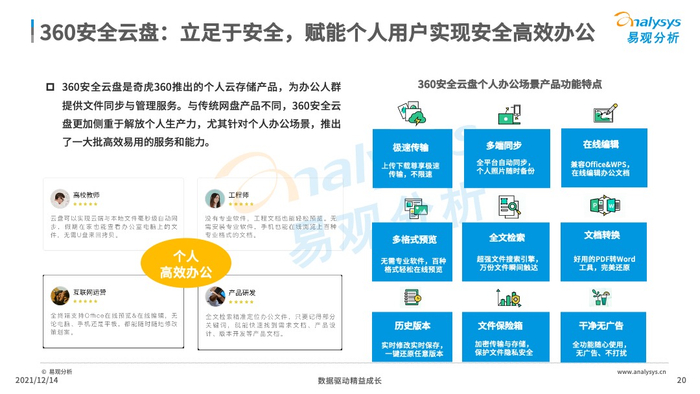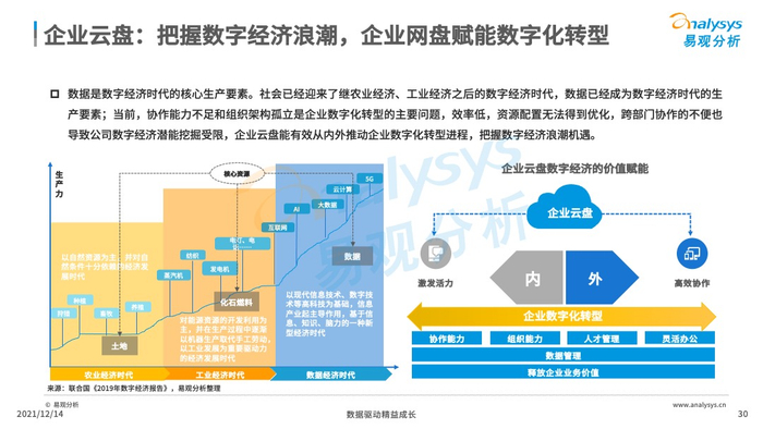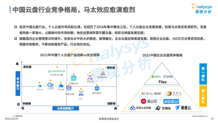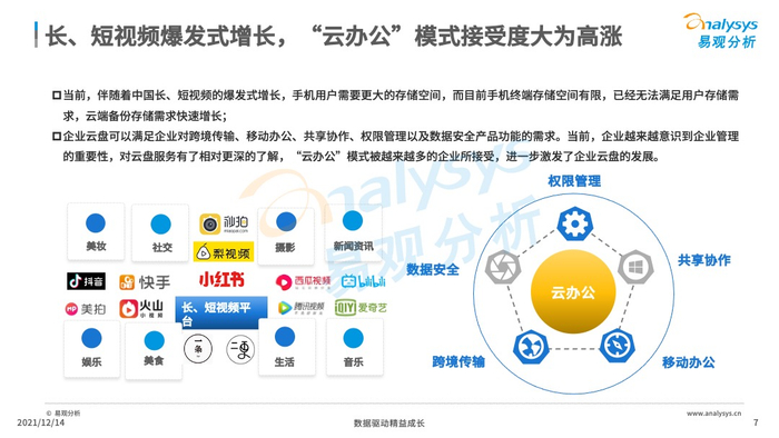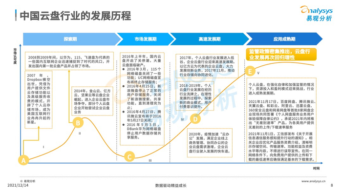 易观分析:随着个人用户和企业数据管理、存储需求的增加,中国云盘行业得到快速发展。纵览中国云盘行业,个人云盘市场风起云涌,在经历了2016年集中整治之后,其市场发展回归理性。在企业服务领域,国内企业管理意识的提升、信息化水平的大步跟进,疫情催化,企业云盘迎来高速发展期。