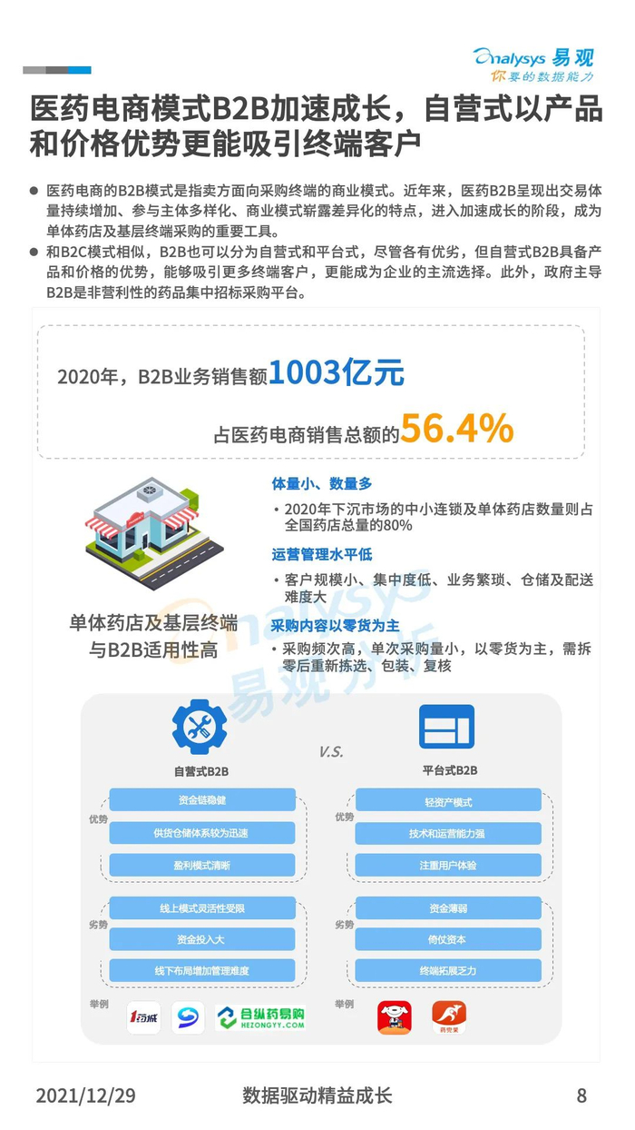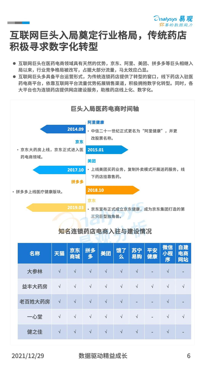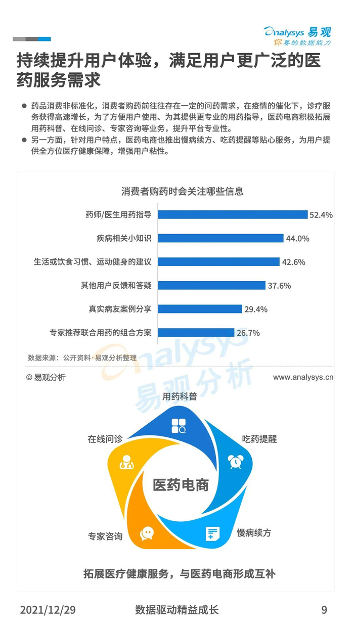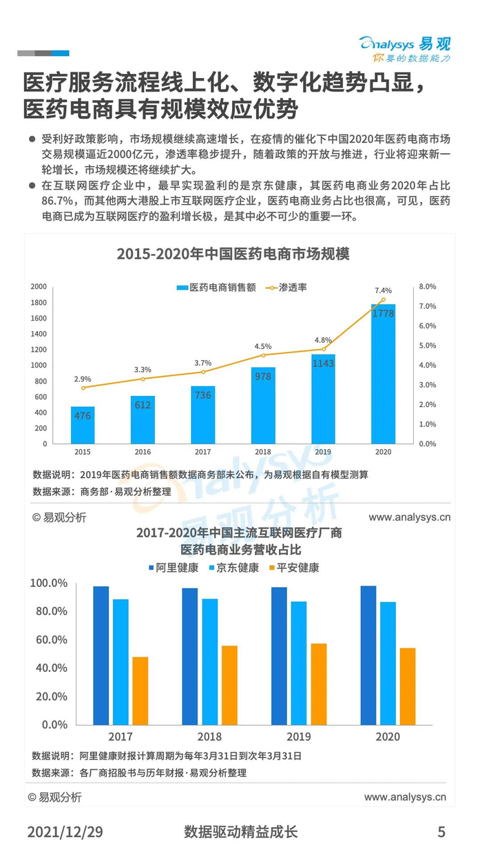 中国65岁及以上人口数量在2020年已达19059万人,占总人口的13.5%,占比持续增加,人口老龄化加剧,发病人口率上升,医疗健康市场进一步扩大。国内居民人均可支配收入稳步上升,消费模式正在升级,随着人们健康意识的增强,医疗保健消费支出占比也在逐渐上升,为医药电商奠定了需求基础。