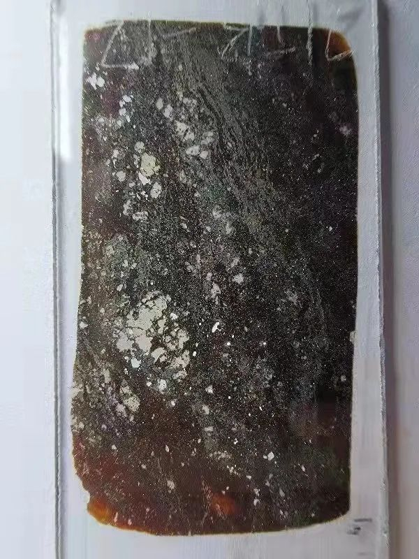 空铁黝银矿样本。(受访者供图)据观察研究,该矿物标本呈灰黑色,反射光下呈灰色,并具有棕红色内反射、不透明金属光泽和黑色条痕,性脆,与深红银矿、闪锌矿、方铅矿、空铁银黝铜矿和黄铁矿等矿物紧密共生。