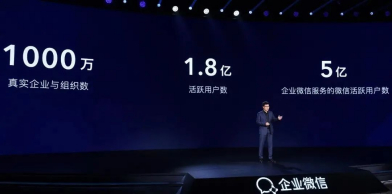 企微官方数据显示:目前企微已超过1000万家真实企业和组织数的1.8亿活跃用户(员工),通过企业微信服务了5亿活跃用户。