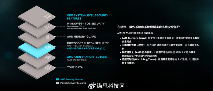 当然,这么厉害的AI能力需要强大的本地AI算力支持。据微软官方要求,至少40TOPs以上的NPU算力、16GB以上内存以及256GB以上SSD,三者缺一不可。AMD作为最早推出独立NPU AI引擎的x86处理器厂商,早在2023年就推出了锐龙7040系列,随后是锐龙8040系列,迄今为止已经迭代到AMD第三代AI PC处理器,其NPU AI算力高达50 TOPS,全面赋能AI端侧应用。