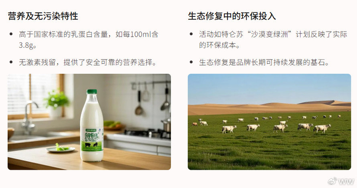 环保成本:有机牧场往往需要投入大量资金进行生态修复和保护(如特仑苏的“沙漠变绿洲”计划)。这些隐性成本虽然未直接体现在标签上,但却是有机奶价值的一部分。