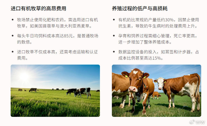 低产与损耗严重:由于有机牧场禁止使用激素和抗生素,奶牛的产奶量普遍低于常规牧场约30%。同时,由于禁用抗生素,奶牛生病时只能隔离治疗,死亡率也相对较高。这些因素都导致了有机奶的生产成本进一步上升。