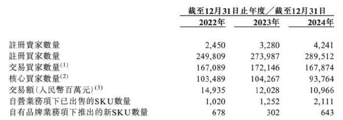 强大的渠道能力,让海拍客积累了足够多的买家。2024年,海拍客注册买家数量28.95万,同比增加5.66%。不过,海拍客却陷入到了买家增加,消费减少的困境。2024年,海拍客交易买家数量16.79万单,同比减少2.33%;平台下单超过24次订单的核心买家数量9.38万,同比减少10.07%。