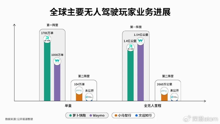 从运营数据上看,萝卜快跑累计订单1700万单,周订单25万单,在全球范围内覆盖22城;Waymo数据仅次于萝卜快跑,累计完成了1000万单,全球范围内覆盖5座城市。其他玩家距离萝卜快跑和Waymo依然有非常大的差距,比如小马智行Robotaxi累计收费单量仅为104万单,差距巨大。
