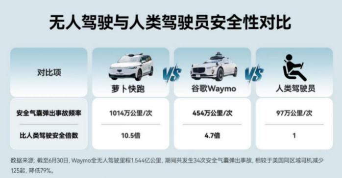 行业统计,人类驾驶每97万公里即可能出现一次气囊触发事故。对比人类驾驶,萝卜快跑的安全冗余度达人类驾驶的10倍以上。