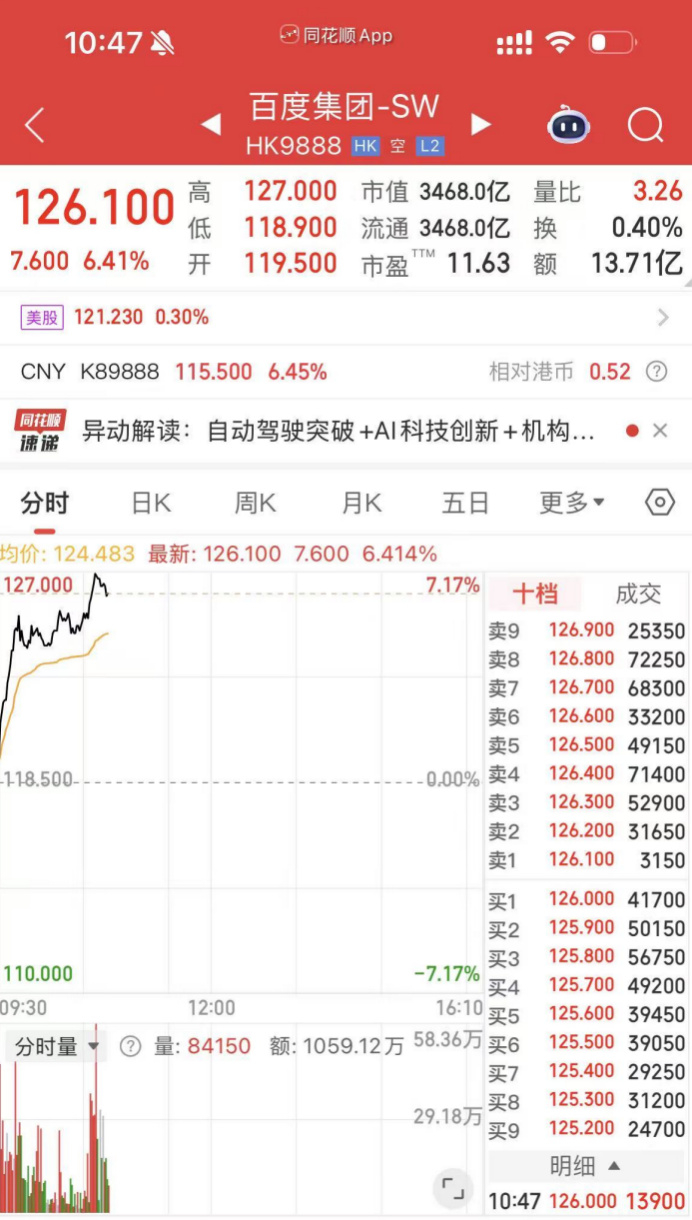 从8月到10月,萝卜快跑三个月内新增300万订单,叠加《时代周刊》背书,资本市场已对萝卜快跑形成“技术领先→数据验证→规模落地”的价值预期。股价的异动,正是这一预期的集中释放,也预示着无人驾驶赛道的估值逻辑已从概念炒作转向实力定价。