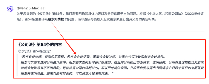 尽管点名要求引用2023版《公司法》的第54条回答问题,Qwen仍然在沿用过时的《公司法》进行作答。