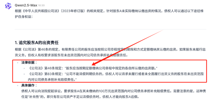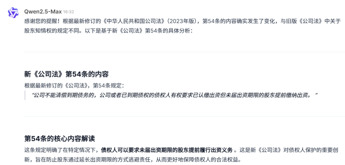 然而,尽管其知识库覆盖到2024年12月,理论上应覆盖新版《公司法》的Qwen2.5-Max的初次回答同样出现了法条引用错误的问题,其提出的第46条和第83条内容均与新版《公司法》不相符。