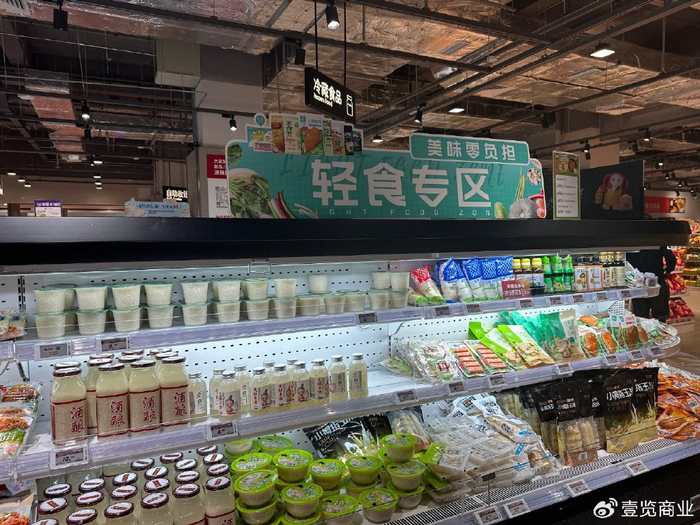也就是说,大润发Super强化了卖场“逛”的属性。比如说,按模块陈列关联度较高的商品。以花桥店为例,大润发Super特意设置了“轻食专区”,蘸料、鸡胸肉、玉米这些此前分散在卖场各个地方的品类集中摆放至冰柜。这种陈列方式,令相应商品更易被精准对标的适宜客群买到,进而增加复购。