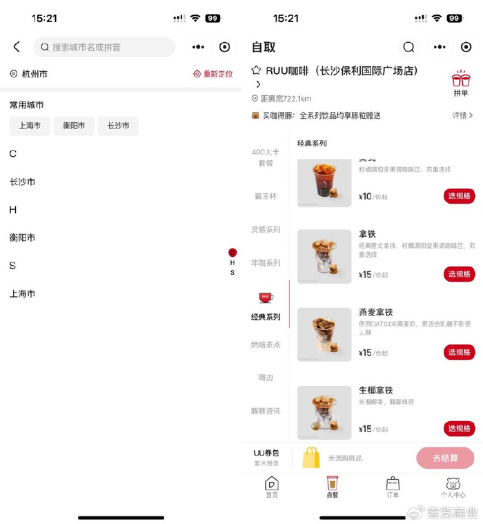 企查查显示,RUU于2022年1月注册,2022年5月在长沙开出首家门店。其门店面积较小,主打自提+外卖,不提供堂食服务,咖啡售价在10-30元之间,还售卖烘焙茶点以及周边。据RUU小程序,截至5月,RUU在全国的门店数仅有8家,分布在长沙、上海、衡阳。
