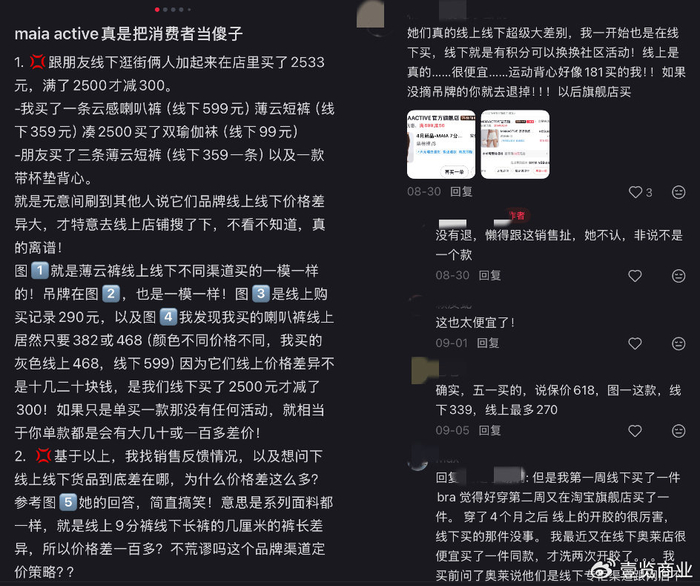 更实质性的伤害来自产品与渠道。有消费者反馈,被安踏收购后,MAIA产品质量出现明显下滑,部分瑜伽裤存在面料起球、缝线脱落等问题。更值得警惕的是不同渠道、不同货源的情况。同样有消费者反馈,在MAIA线上旗舰店、抖音直播间与线下专柜的同款产品,在面料触感、工艺细节上存在差异。