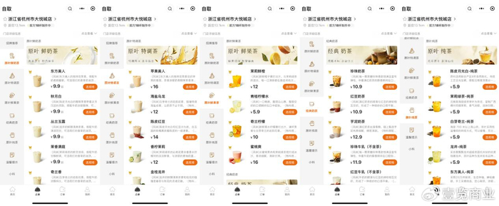 产品方面,香飘飘主打“原叶现泡”概念,从目前的菜单列表来看,有原叶鲜奶茶、原叶特调茶、原叶鲜果茶、经典奶茶、原叶纯茶五大系列,强调使用原叶茶底、新鲜牛乳,价格在5.9元到16元之间。