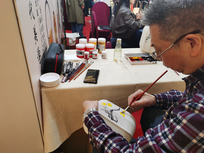 师傅在亚麻灯罩上作画 《消费者报道》记者摄当日,在中山市沐阳文化传媒有限公司的展位前,正在作画的师傅对《消费者报道》记者称,其设计理念为“以灯为主、以画为辅,通过创新和古为今用,将灯具的实用性与艺术性融合起来”。