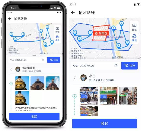 通过成员的拍照和打卡记录,马克水印相机将生成可视化的打卡路线图。每个现场人员的拜访和货物铺设将更清晰地分布在路线上。同时,智能电子围栏可以管理和设置每个现场员工的工作和拍照范围,并及时通知异常情况。