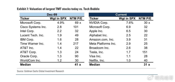 至于最后一点,见下表,来自高盛经Derek Thompson转述。你会发现,1998-2000年互联网泡沫期间,微软、思科和甲骨文的市盈率远高于今天最大的AI玩家——英伟达、微软、谷歌、亚马逊和Meta(OpenAI无盈利)。事实上,微软当前市盈率仅为26年前的一半!我经历的第一个泡沫——1969-72年Nifty-Fifty——主流公司市盈率甚至高于98-00年。