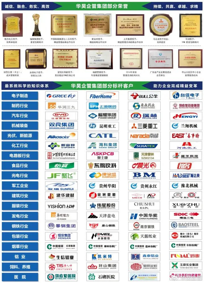 深圳华昊联合企业管理顾问有限公司(简称:华昊企管)成立于2012年,为深圳华昊企管集团旗下核心子公司,是一家以精益管理咨询为核心,专注于企业生产运营管理能力提升与精益化标杆工厂建设,以帮助企业提质、降本、增效、创新,促进企业永续经营为目标。