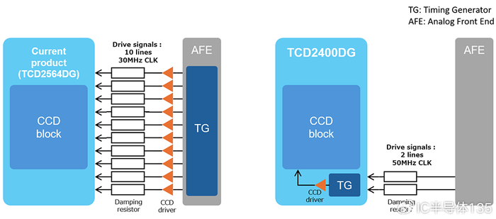 图1:TCD2400DG与东芝现有产品驱动端子数量的对比