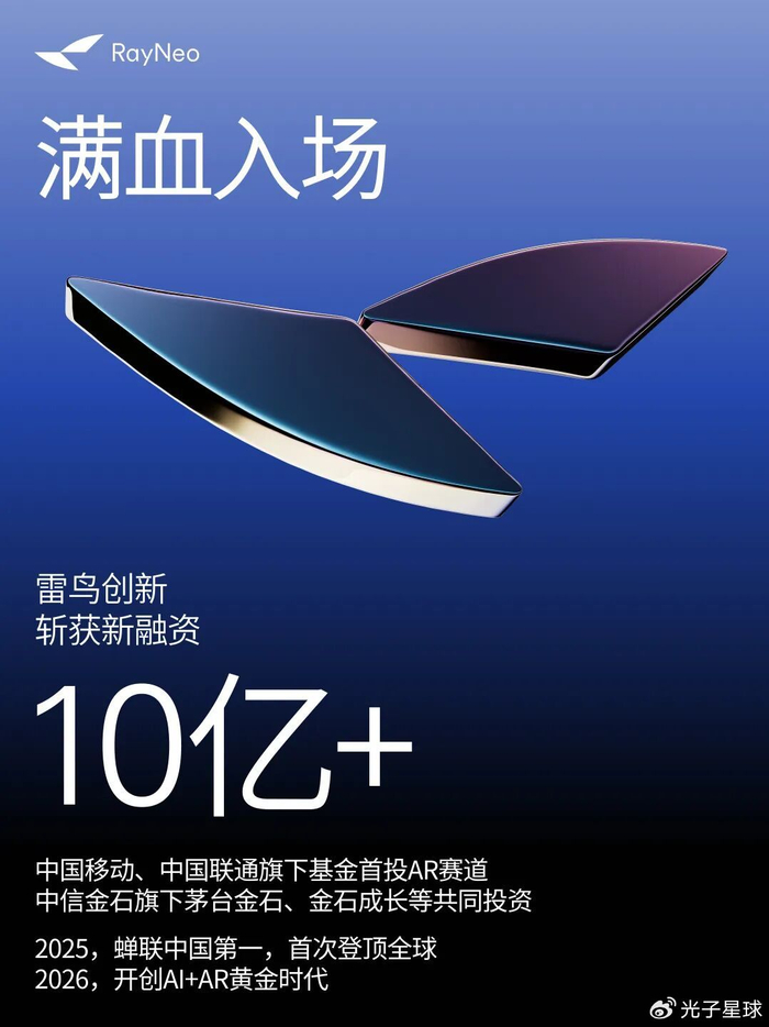 据媒体报道,2026年1月5日,雷鸟创新宣布完成新一轮超10亿元融资,其中,主要的资方包含了中国两大运营商旗下基金——中国移动链长基金与中国联通联创创新基金。