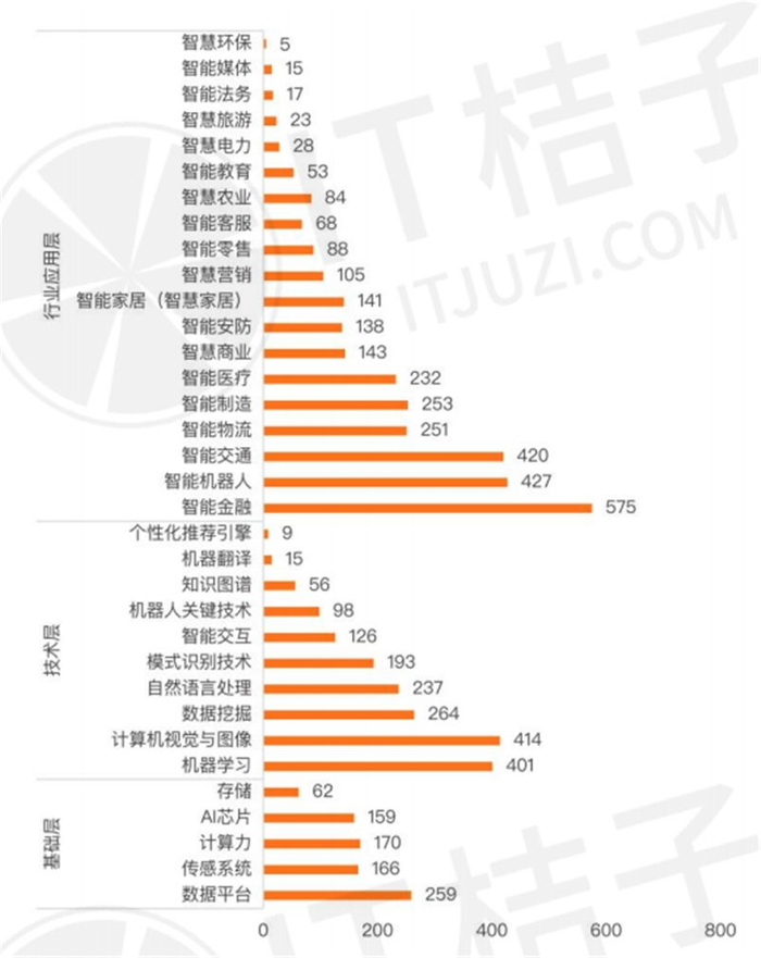 IT 桔子收录到的历史数据显示,在所有获投人工智能公司中,行业应用层所处公司最多共有 3322 家,占据了 55%的份额;其次为技术层公司有 1813 家,占比 30%;数量最少的为基础层公司共 816 家,占比 14%。