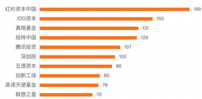 IT 桔子收录到的数据显示,中国人工智能产业最活跃的投资方前十名分别为红杉中国、IDG 资本、真格基金、五源资本、腾讯投资、英诺天使基金、创新工场、深创投和联想之星。这其中,截止到 2021 年底,红杉资本中国出手中国 AI 投资 199 次,位居榜首;IDG 资本以 150 起的投资事件位居第二;真格基金则凭借 131 次的投资数量名列第三位。