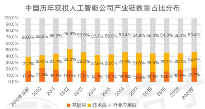 不过数据趋势是,基础层投资在不断增长。在中美贸易摩擦的大背景下,以 AI 芯片、计算力、数据平台等为核心的 AI 基础层投资占比正在提升。到 2021 年最新数据是,占比21.7%。