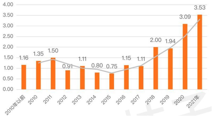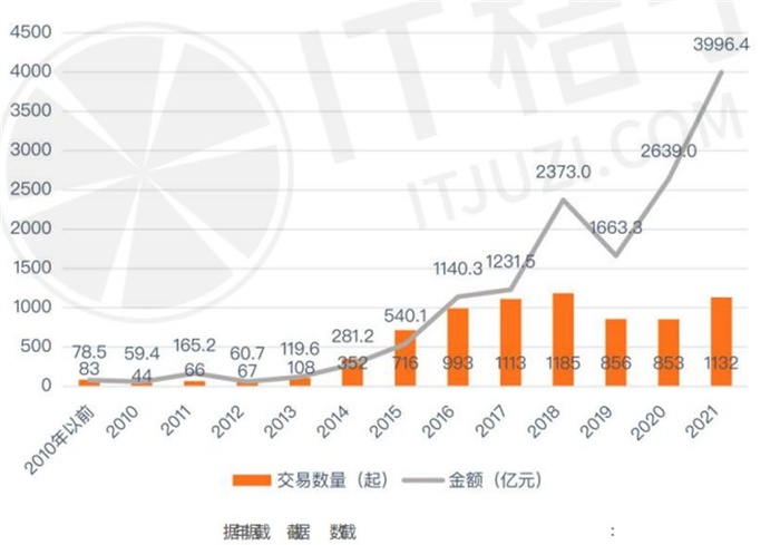 随着投融资事件的增加,投资金额也发生了变化。自 2010 年以来,历年投资金额处于增长趋势,尤其是 2015-2021 年期间,投资金额增长明显。在 2014 年及以前,投融资全年金额仅仅在百亿、十亿级别徘徊,2015 年之后投融资金额上升至千亿级别,2021 年创造了新记录投融资金额达到 3343 亿元。