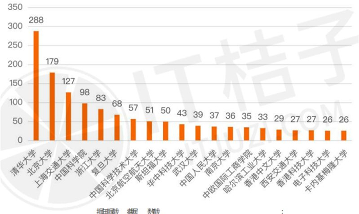 根据 IT 桔子数据显示,中国 AI 领域创业者中,毕业于清华大学的有 288 位占据首位,其次是北京大学有 179 位,上海交通大学有 127 位。其他孕育 AI 人才的中国高校还包括中国科学院、浙大、复旦、中国科学技术大学、北航等,海外的高校还有斯坦福大学、卡内基美隆大学等。