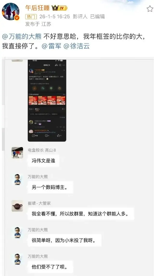 这次事件的起源是一次网传的合作。1月5日,小米被曝出和长期批评品牌及米粉的自媒体“万能的大熊”接触,并有投放商业合作的意向。这顿时引发了大量米粉的不满,迅速引爆了科技圈,相关话题也冲上了微博热搜。