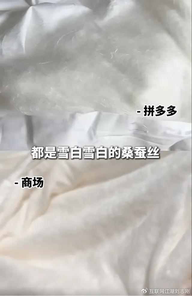 “做工用料上,商场卖的万元的蚕丝被,被套都是桑蚕丝的,而且做工用料显然好了不止一个档次,拆开来看,拼多多卖的蚕丝被与商场一样,里面都是雪白雪白的桑蚕丝,厚厚一层但一点也不皱。”博主说。