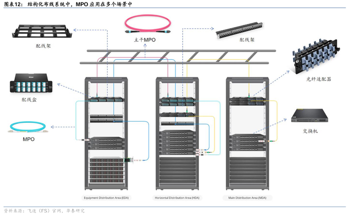 图片说明:AI数据中心普遍采用结构化布线,导致MPO光纤跳线用量上升,数据来源于华泰证券