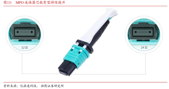 图片说明:左边为12芯MPO,右边为24芯MPO,每个圆点都是一根光纤,数据来源于浙商证券