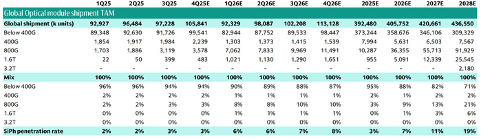根据高盛的测算,预计2026年全球光模块合计出货4.06亿个,其中400G及以下的光模块出货量为个3.59亿个,而400G及以上的光模块出货量约4710万个:包括560万个400G光模块、3640万个800G光模块、5100万个1.6T光模块。