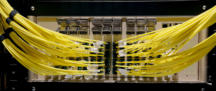 下图是CPO交换机Quantum 3450-LD,也是采用144根MPO光纤跳线(144根黄色光缆),芯数暂时未知,数量上与GB200 NVL72方案没有变化,区别在于没有光模块,而是MPO光纤跳线直连交换机。
