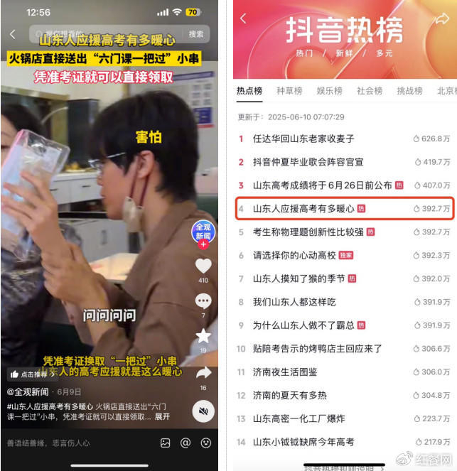 2025年高考期间,许府牛推出“凭准考证免费领‘一把过’牛肉串”活动,单日送出超20万串。该活动不仅强势登陆山东多地抖音热点榜,其关联话题 #山东人应援高考有多暖心# 更迅速突破千万浏览量。这一案例不仅是一次现象级营销,更印证了餐饮行业正从单纯“价格战”向构建“情感价值”营销的重要升级趋势。