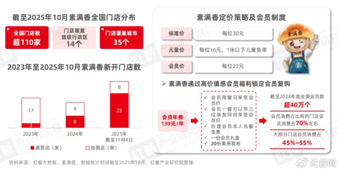 近年来,素满香保持稳健扩张的态势,截至2025年10月,其门店数已经超过110家,覆盖14个省级行政区和35个城市。在拓店策略上,素满香一方面以北京、上海、深圳、杭州等一线城市及重点新一线城市为核心发展区域,另一方面则深耕浙江省内的下沉市场。