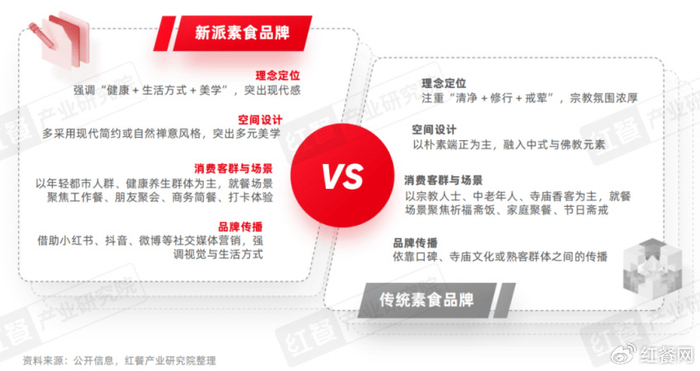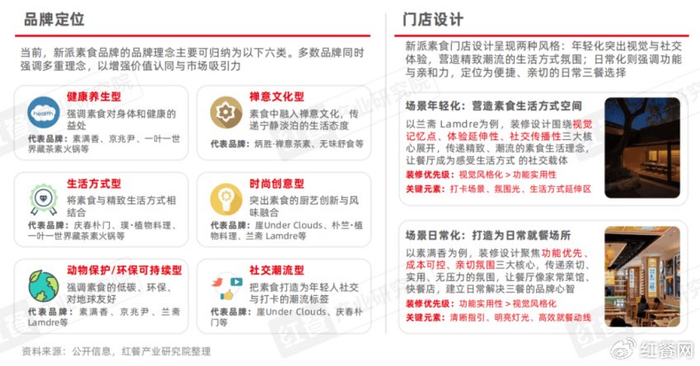 总体上看,与传统素食品牌相比,新派素食品牌在理念上更突出健康、生活方式与美学属性,通过现代化空间设计、社交媒体传播以及贴合都市生活的消费场景,逐渐吸引年轻消费人群并淡化宗教色彩。本报告将以新派素食品牌作为主要研究对象。