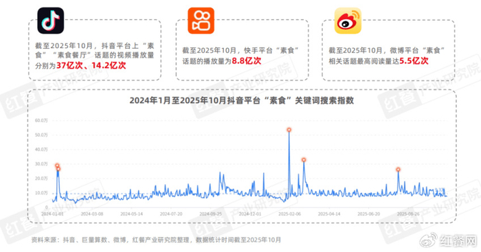 近年来,随着健康、可持续和多元化消费理念的兴起,素食在社媒平台上始终保持较高的热度。据巨量算数,截至2025年10月,抖音平台“素食”“素食餐厅”话题播放量累计达到37亿次、14.2亿次。同时,抖音平台上“素食”关键词搜索指数在2024年1月至2025年10月期间,形成了多个搜索波峰。
