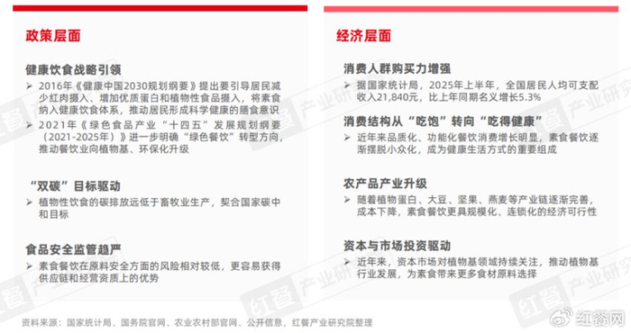 此外,在政策引导与经济迭代的双重作用下,素食品类正迎来发展新契机。一方面,素食作为健康、低碳的饮食方式代表,近年来发展备受国家关注。国家以“健康饮食”战略为统领,从顶层设计推动素食产业向健康化、绿色化升级。另一方面,消费者健康饮食需求升级与农业产业优化形成的双向合力,驱动着素食品类的发展。