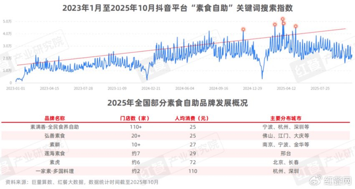 近年来,随着自助模式越来越受到市场青睐,素食自助也逐渐成了大众关注的素食细分赛道。据巨量算数,从2023年1月至2025年10月,抖音平台“素食自助”搜索热度整体呈上升趋势。