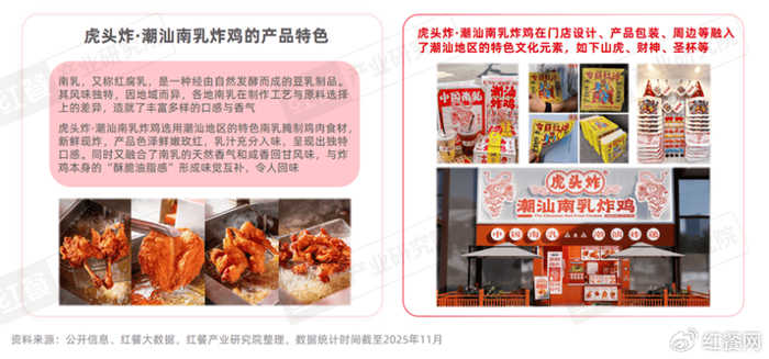 在华南区域,以南乳炸鸡为特色的虎头炸·潮汕南乳炸鸡,已在全国开出近500家门店,其2024年11月—2025年11月,净增门店超过300家,在南方尤其两广区域,发展势头较猛。